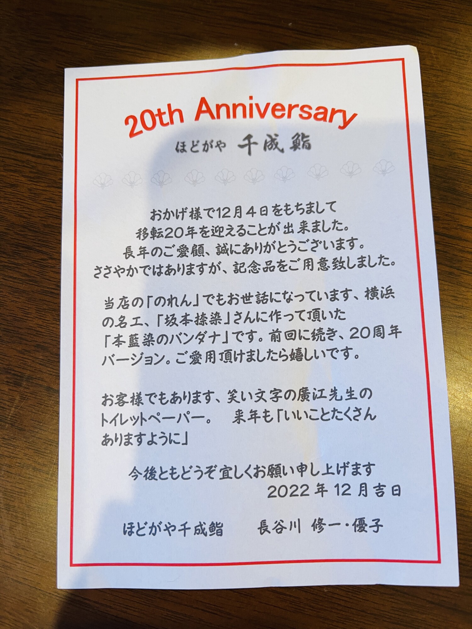 実は先日、20周年のお祝いに、ほっこりしていただこうと思って私から送った笑文字のトイレットペーパー。