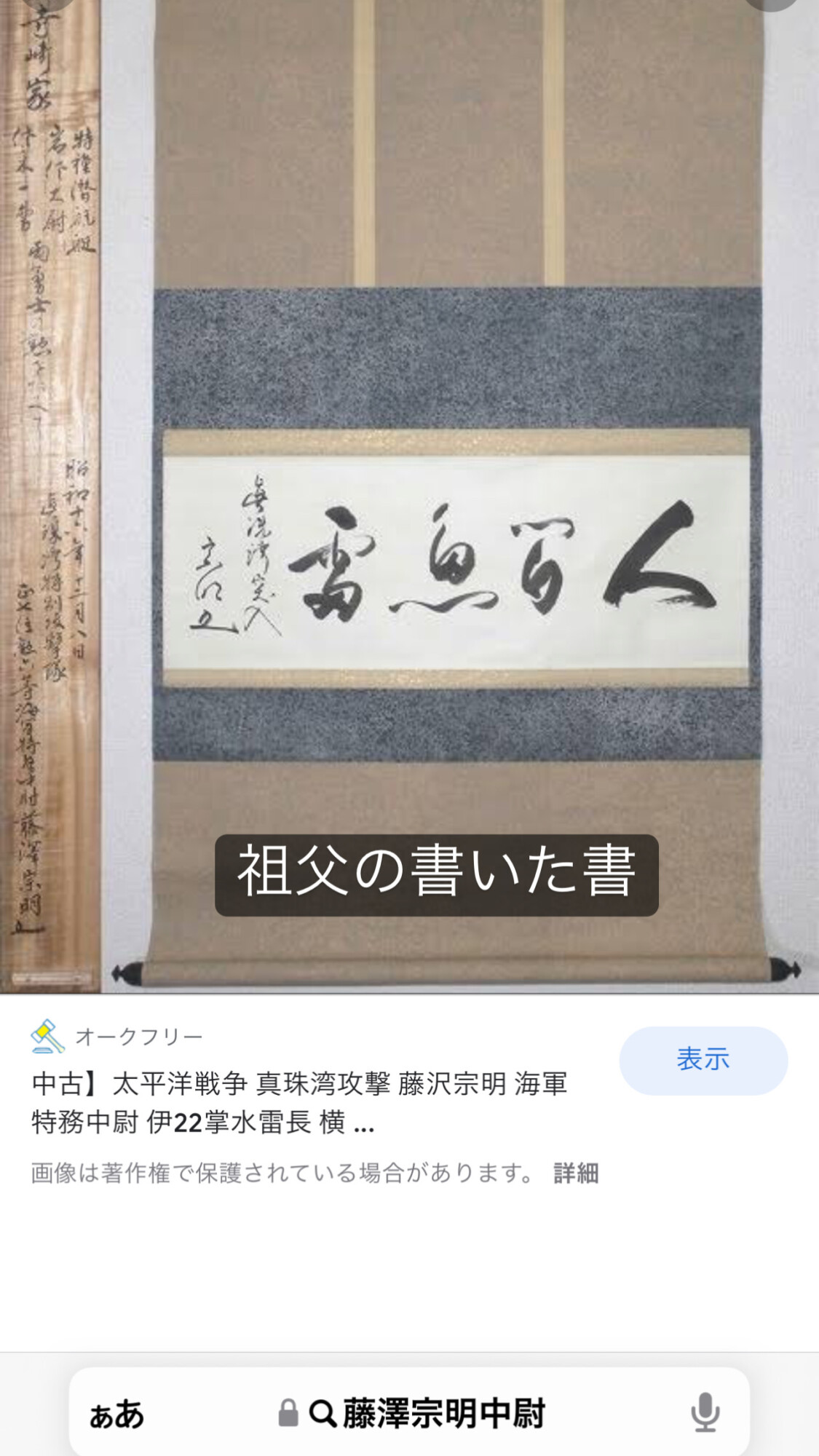 また、ヤフーオークションでは、祖父、藤沢宗明の「人間魚雷」の書を見ることもできました。